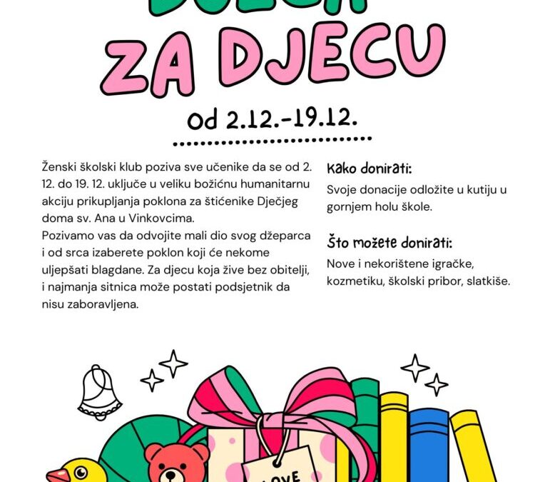 Ženski školski klub poziva sve učenike da se uključe u humanitarnu akciju prikupljanja donacija za djecu Dječjeg doma sv. Ana u Vinkovcima.